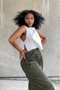 Versatile crop top with a boatneck style and open collarbone. Char has side seam slits, enclosed by exaggerated ties. Can be worn 2 ways, with strings tied to the side for a clean but chic look or wrapped across to create a more fitted shape.