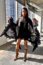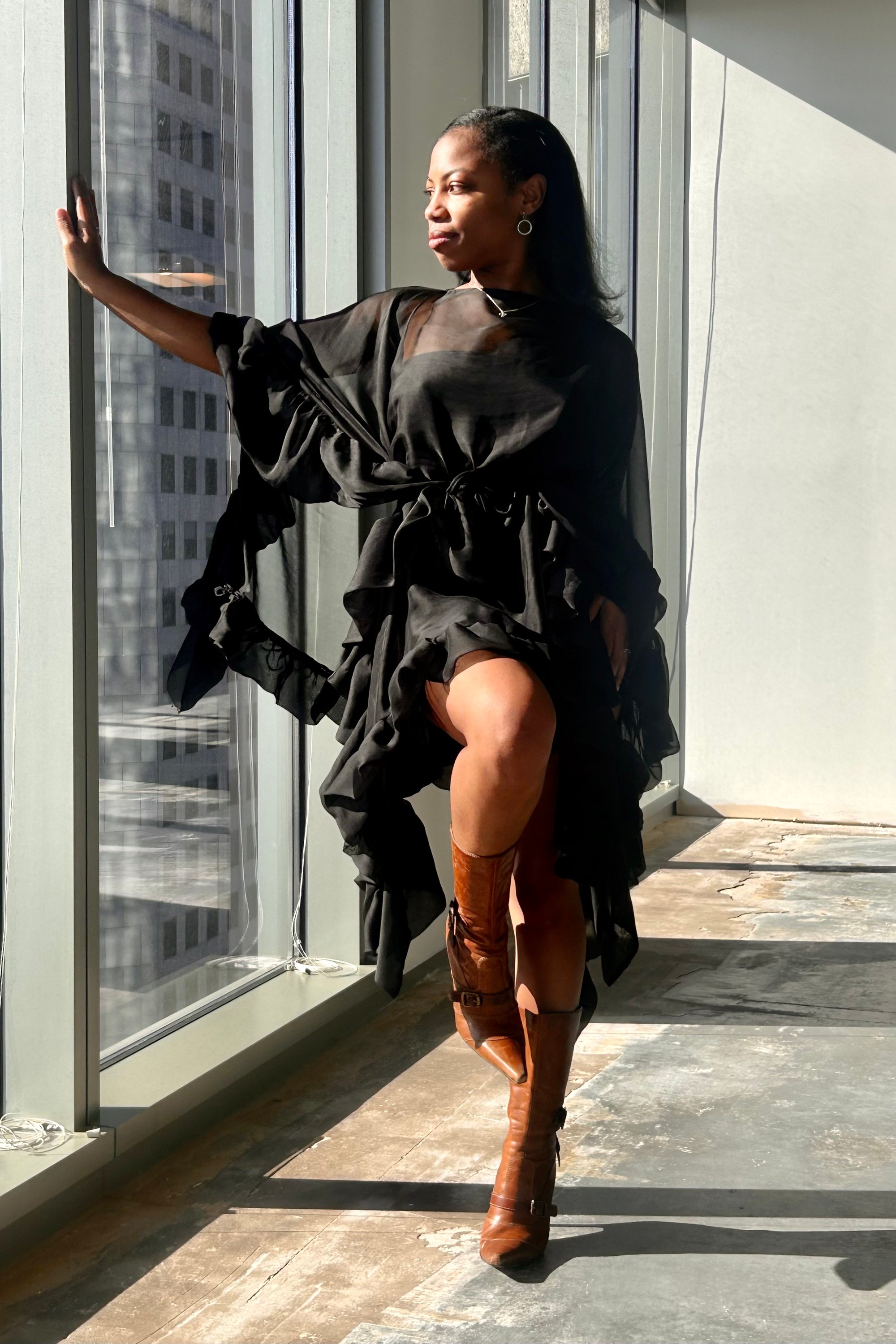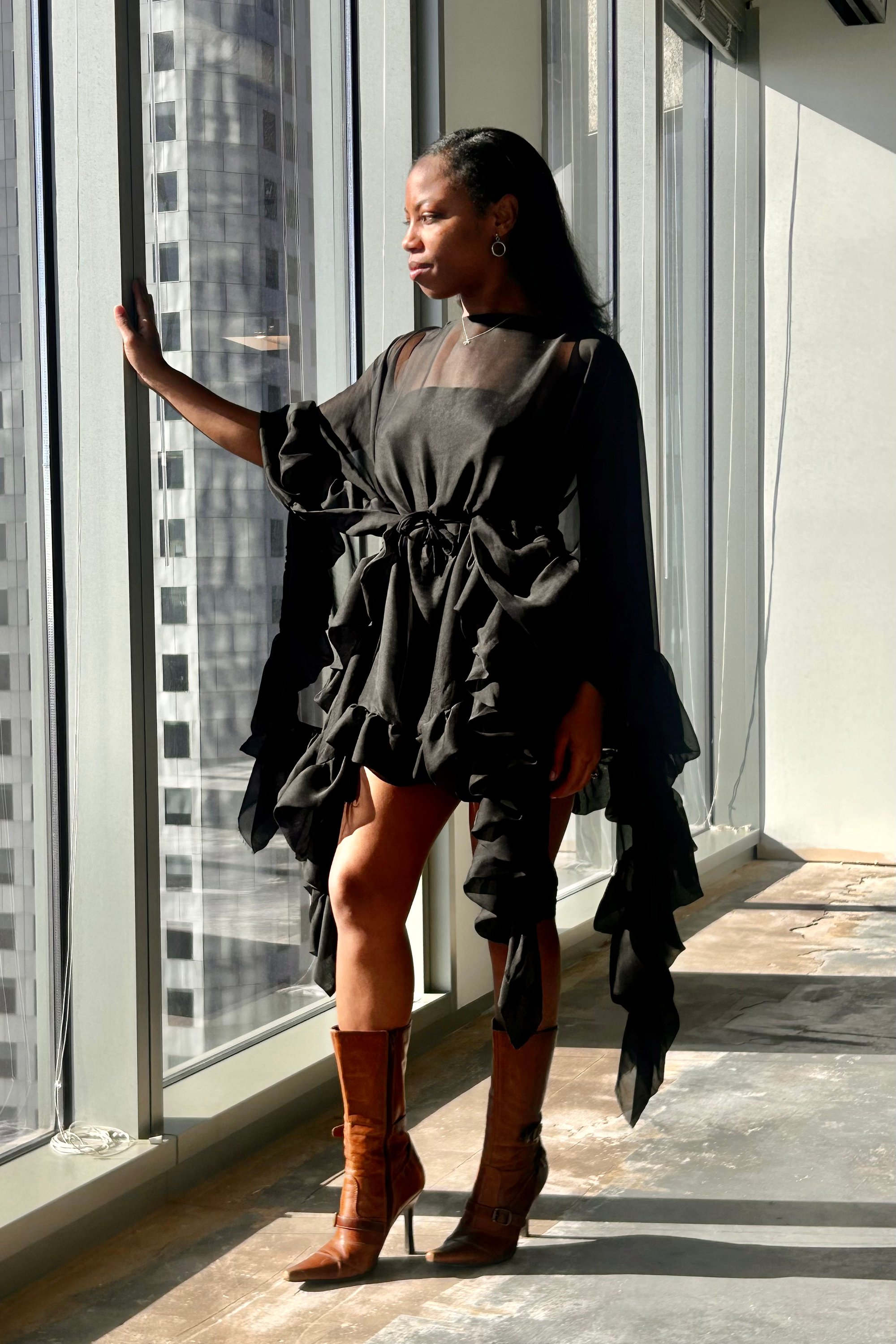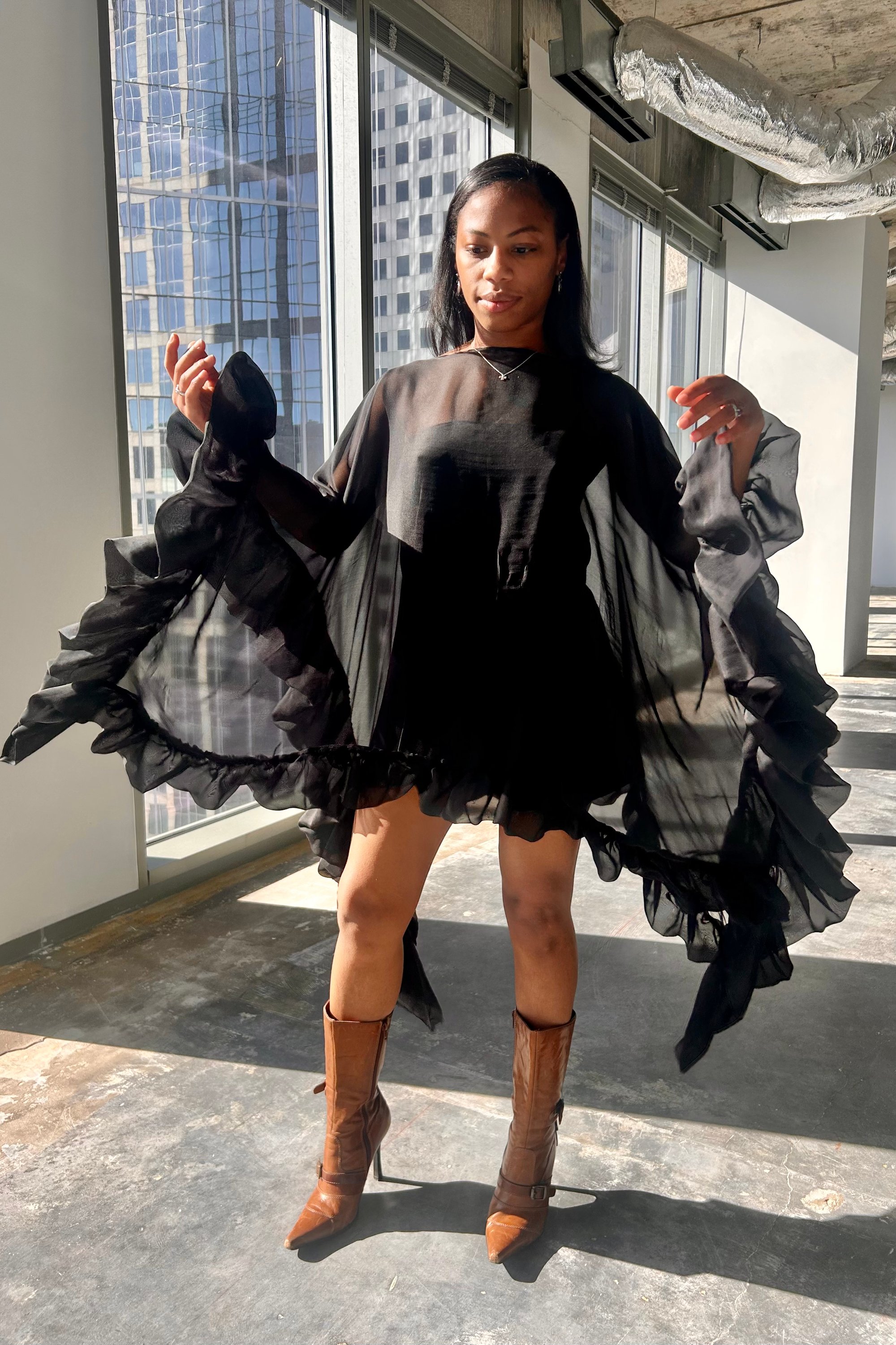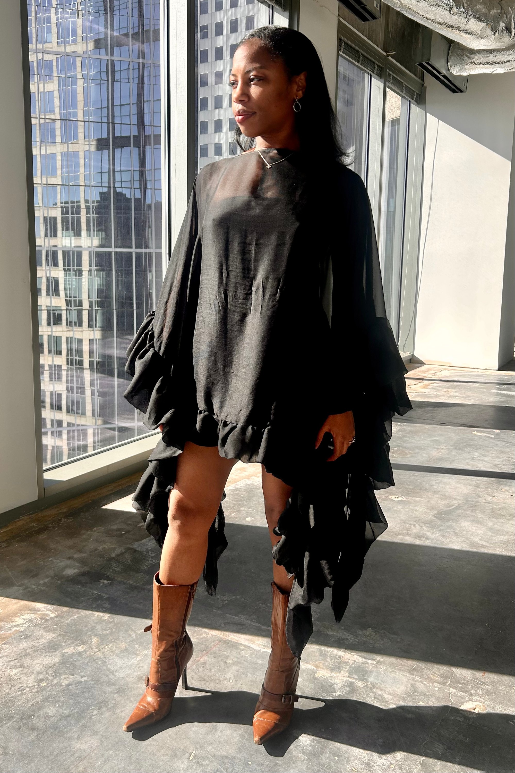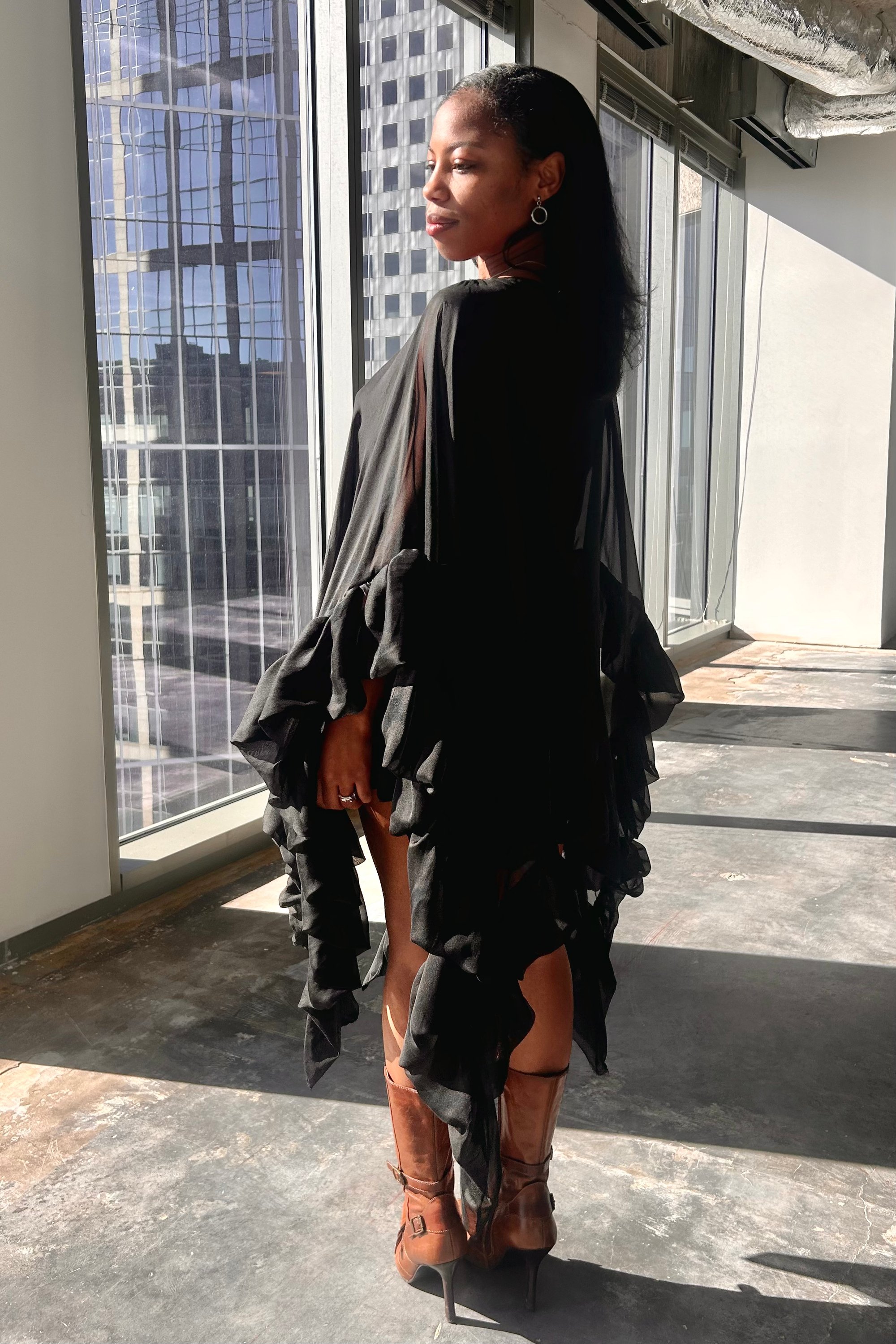 Made to order, boat-neck chiffon silk cape with ruffle trimmings. The Shun Cape features a thin chiffon belt for versatile wear, a beautiful drape, and exaggerated ruffles that hang off the edges of the cape.